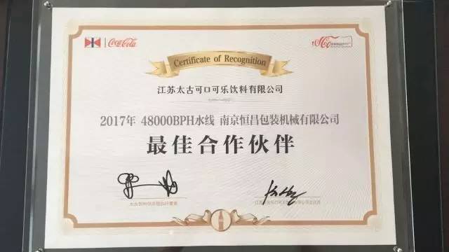74日,江蘇太古可口可樂有限公司舉行了一場盛大的新水線運營揭幕儀式。作為該項目后段包裝總包商南京恒昌包裝機械有限公司獲邀參加儀式,并得到了太古可樂的高度肯定,獲得“最佳合作伙伴”殊榮!